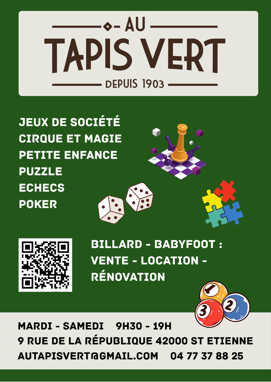 Spécialiste en jeux à Saint-Etienne depuis plus de 100 ans, le Tapis Vert vous accueille dans son magasin de plus de 100m², en plein coeur du centre-ville, avec pas moins de 2000 références en stock pour vous offrir un large de choix de produits. Soucieux de vous apporter un conseil adapté et personnalisé, notre équipe se tient à votre écoute pour vous proposer l'article qui vous séduira dans le respect de votre budget. N'oubliez pas que nous vendons également des billards et des baby-foot et que nous prenons en charge l'entretien et la réparation du vôtre même si vous ne l'avez pas acheté chez nous. Le Tapis Vert c'est avant tout une équipe passionnée au service de votre loisir, votre plaisir, votre détente.
